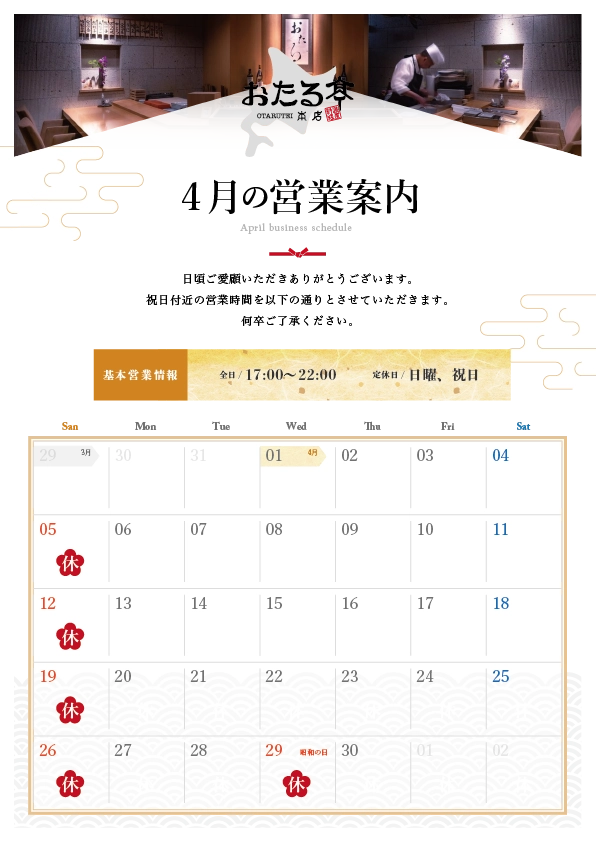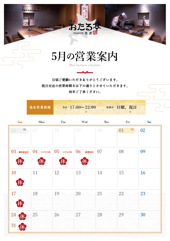 定休日が日曜・祝日のため、カレンダー通りに定休させていただき